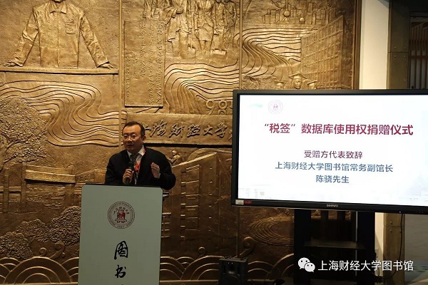 上海财经大学图书馆常务副馆长陈骁先生代表受赠方致辞。他提到,作为我校历史上第一次接受数字资源的捐赠,税签数据库具有重要的意义。目前,图书馆文献资源建设中数字资源已占到相当大的比例,已构建了富有财经特色的数字资源体系,尤其是事实统计型数据库对我校师生开展实证研究、保障案例教学起到了重要作用。税签数据库的捐赠将带来我校图书馆资源建设的新模式,促进税收专业文献资源建设与学科服务。