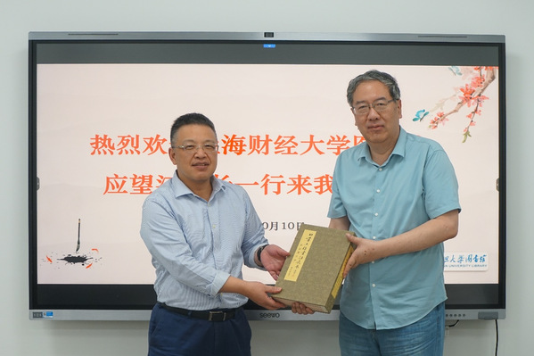 应望江馆长感谢复旦大学图书馆的热情接待和精彩分享。表示,复旦大学图书馆是上财图书馆新一届领导班子重点调研学习单位,在学科交叉日益紧密背景下,希望未来双方继续保持沟通与合作,谋发展、求共赢,共同探讨数字化时代和中国式现代化背景下高校图书馆转型发展新路径。复旦大学图书馆馆长陈引驰代表复旦大学图书馆向上财图书馆赠送《四书五经书法长卷》,他期待,上财图书馆与复旦大学图书馆未来在保持既有合作的基础上,能进一步拓展合作渠道,搭建更为广阔的创新联建平台,打造跨高校、跨学科的馆际深度合作模式。